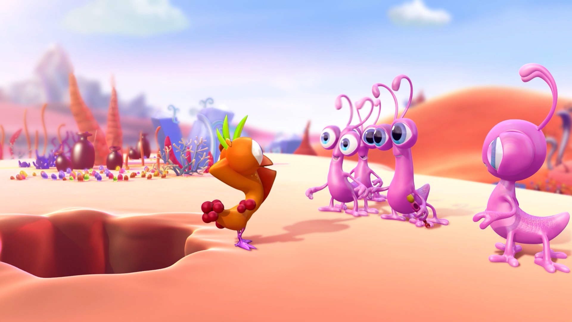 Bumbly finds an Agings' egg in the forest. Playing with it, it unintentionally drags it to the Bagingas' side. The egg breaks and a nestling hatches out. It starts chasing Bumbly trying to play with it...