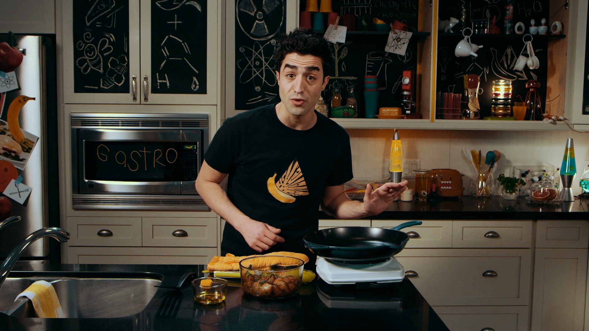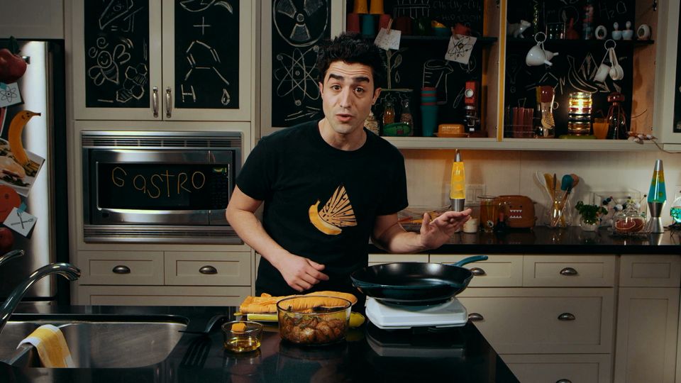 Sportscaster Chip Dippington is impressed by Link’s tag-team recipes of crunchy taco shells made from store-bought tortillas and a delicious fish filling. Indeed, Link shows how to create a light golden brown crust on the fish through proper searing, which as I.Q. explains, is due to a chemical reaction called the Maillard Reaction. Taking the guesswork out of cooking with a meat thermometer, Link is sure the fish is thoroughly cooked and ready to build some tasty fish tacos.